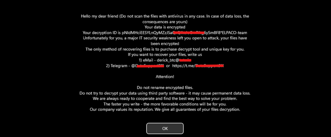 ELPACO use ChaCha20 as encryption algorithm, during the process it avoid to encrypt critical files like those in \windows\. All the files are renaimed with .ELPACO-team extension. Inside the temp folder it drop session.tmp as a ricovery key to use in case the program is stopped mid encryption for whatever reason