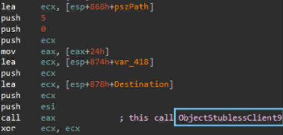 Its basically abusing a feature of Windows COM objects. This is a known technique for UAC bypass where the program abuse an auto elevated COM object like cmstplua com interface The call to CoGetObject take as an argument the entire moniker string: Elevation:Administrator!new:{3E5FC...} and return a pointer to the interface of the requested object. After this there is a call to ObjectStublessClient9, the 9 indicate the index inside the vtable of the interface ICMLuaUtil. We can do a little of reverse engineer of the vtable to understand what it does