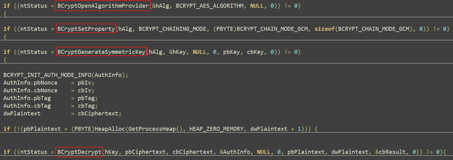 We are using the decrypted ABE key with the Windows Cryptography API: Next Generation, for this you will need to import bcrypt.h in your code
