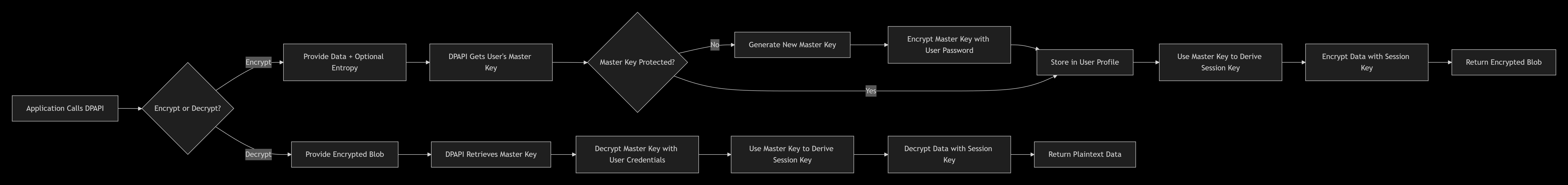 Every application inside the system can have access to this API and use it to secure store their data, however dpapi has a big weakness: In order to access it someone only need to work from the user context, this mean that every medium-integrity process running in the user session can easily decrypt data using CryptUnprotectData function