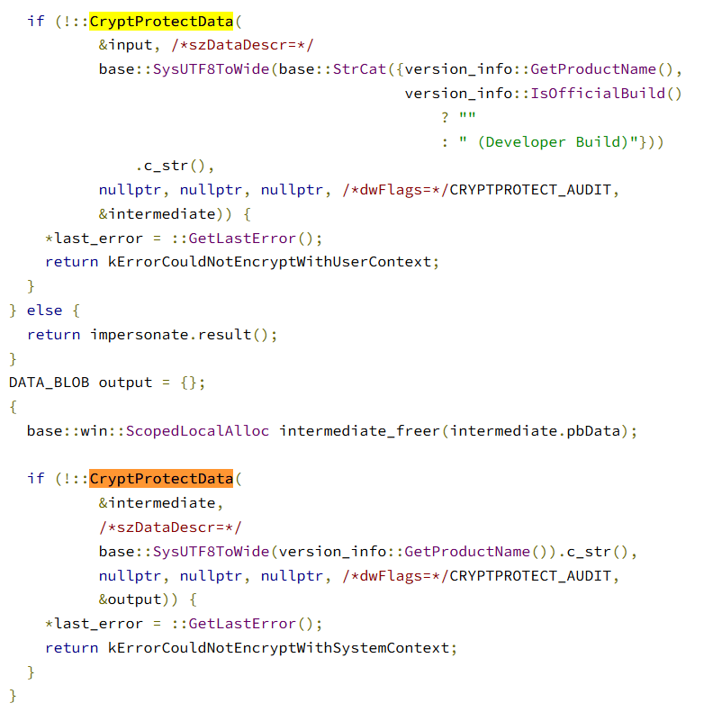This ensure that only the elevated services can decrypt the stored data and only the browser process can request to decrypt the data.