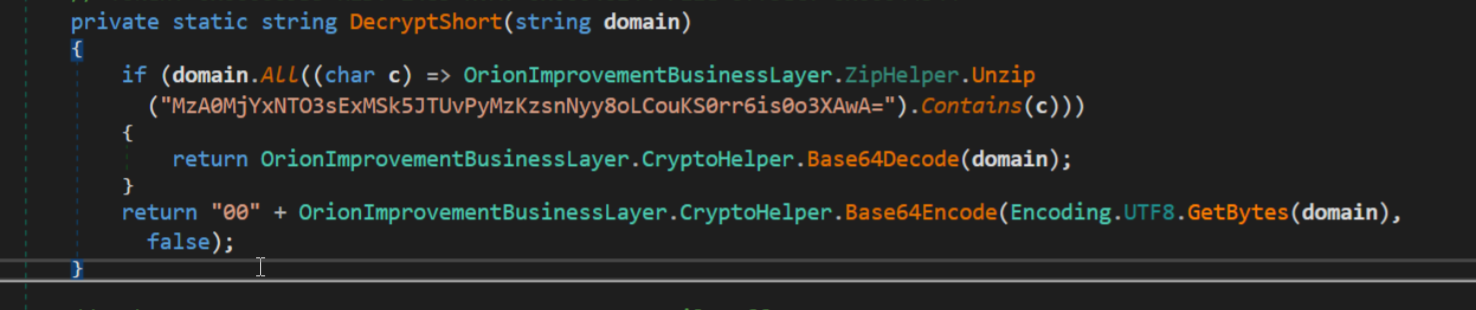 DecryptShort method first check if all the characters of the domain are part of this string: 0123456789abcdefghijklmnopqrstuvwxyz-_. If it is the case the domain will be encoded using OrionImprovementBusinessLayer.CryptoHelper.Base64Decode Otherwise will be prepended with "00" and encoded using OrionImprovementBusinessLayer.CryptoHelper.base64Encode