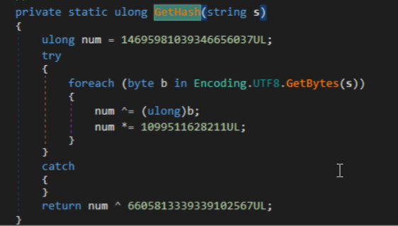 Doing a reasearch online about the constants in the algorithm we can see its using FNV hash function All the reverse-enginereed hashes are available here