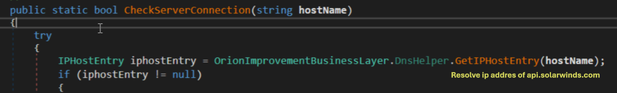 Then Sunburst before initilazing the connection with the C2 check if the host api.solarwinds.com resolve to an expected IP address